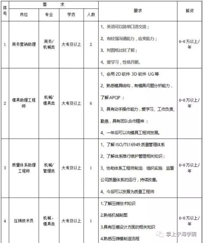 宁波泛德压铸有限公司(简称NFD)创建于2001年10月,坐落于宁波江北投资创业园区B区,占地面积约20000多平方米,是一家专业从事铝合金、锌合金压铸模具开发制造、压铸、机加工、表面处理等的企业。公司于2003年通过SGS公司的TS16949质量体系认证,2017年通过IATF16949:2016认证。公司主要制造汽车、电器、消防器材、仪表等行业的各类精密产品件,产品远销欧美、日本等国家,并与一些大型跨国公司、集团,有着长期且良好的合作关系。年销售额8000万,年产2500吨铝合金压铸件。招聘岗位